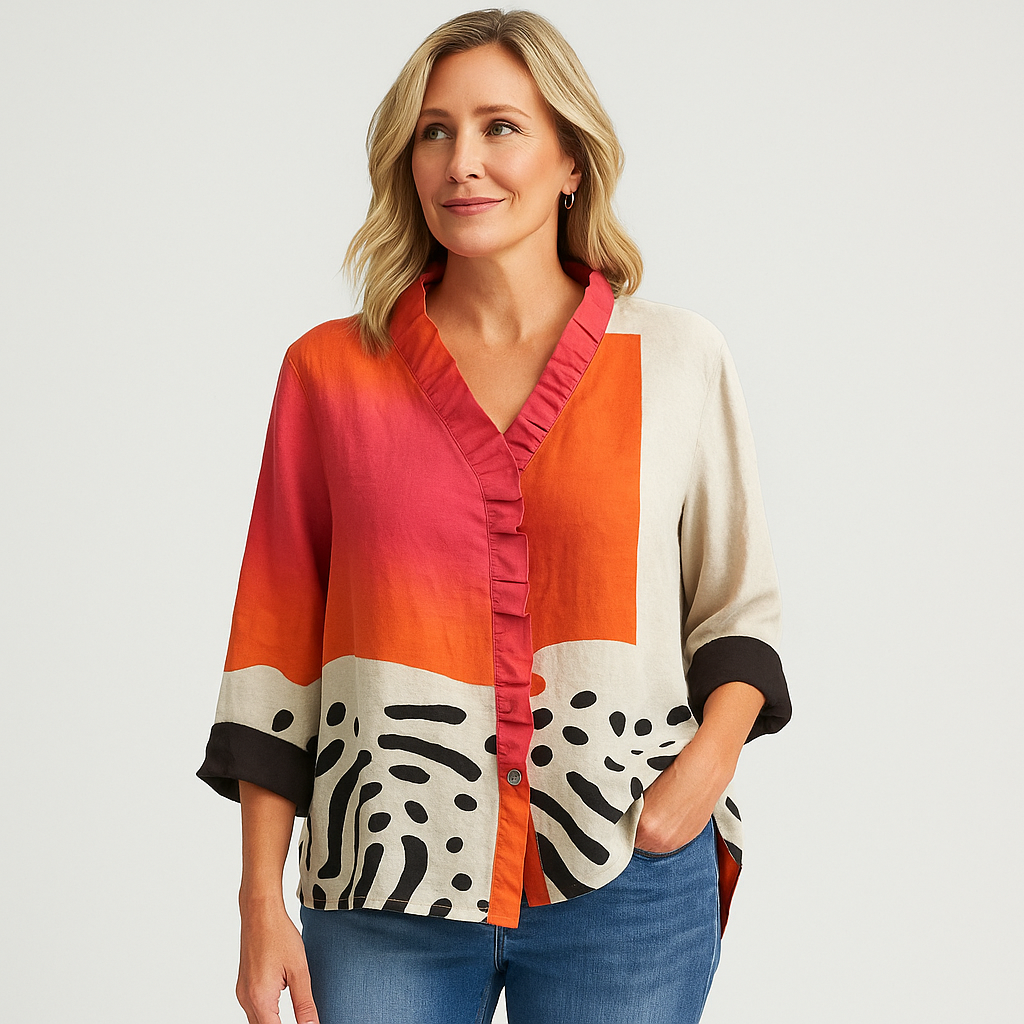 Diese Bluse vereint luftigen Komfort, feminine Details, atmungsaktive Leichtigkeit und ein angenehmes Tragegefühl. Mit sanften Volants und lockerer Silhouette ist sie ideal für heiße Sommertage.
