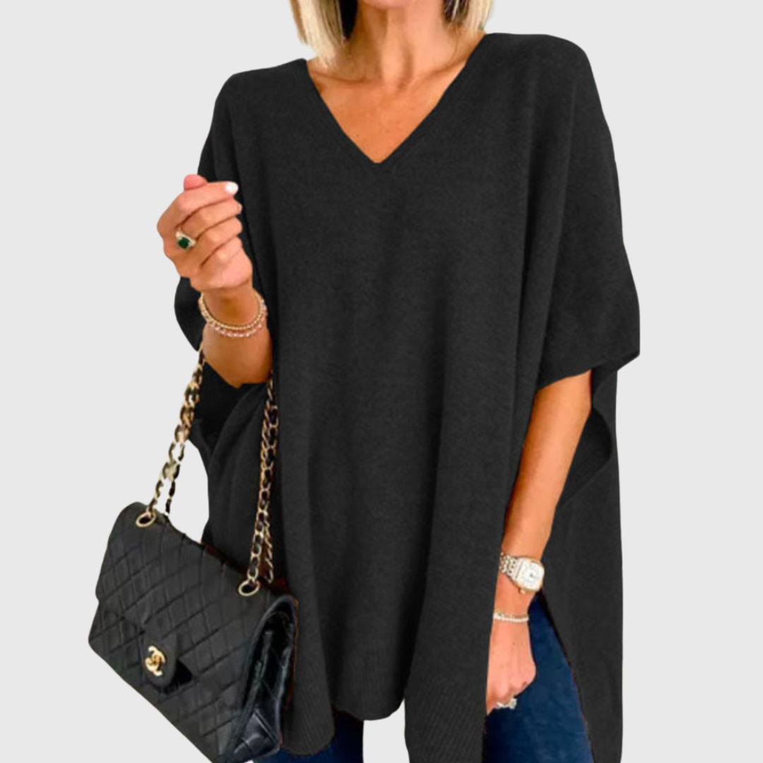 Der handgefertigte Poncho-Sweater Erica kombiniert Komfort, Stil und Leichtigkeit in einem festlichen Design. Mit lockerem Schnitt und elegantem V-Ausschnitt ist er das perfekte Stück für kalte Abende und stilvolle Outfits.