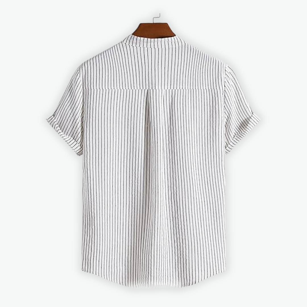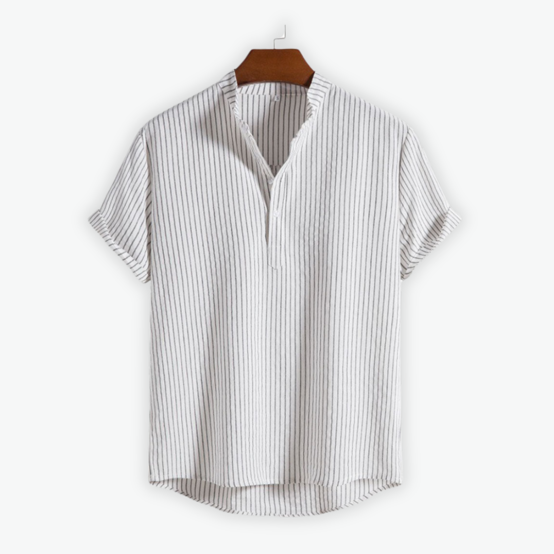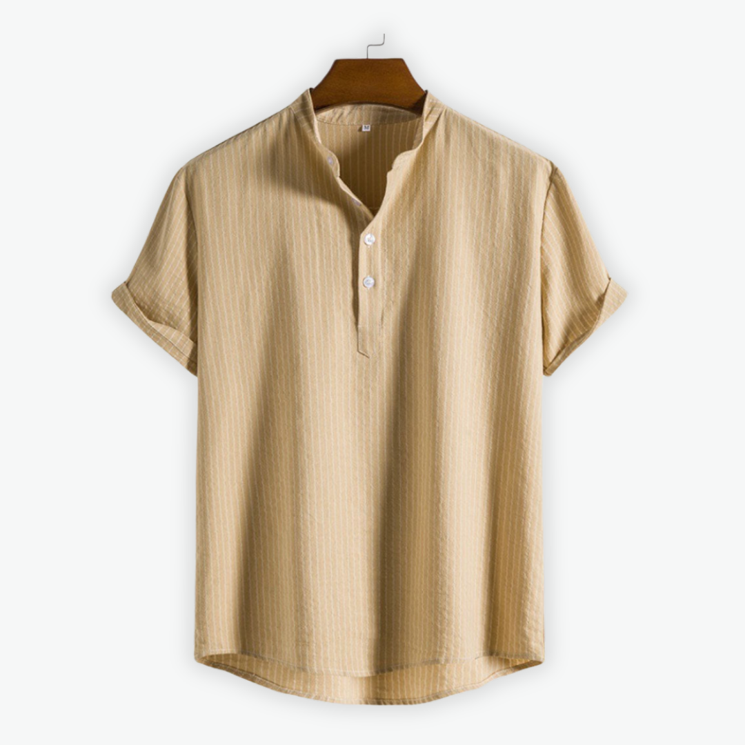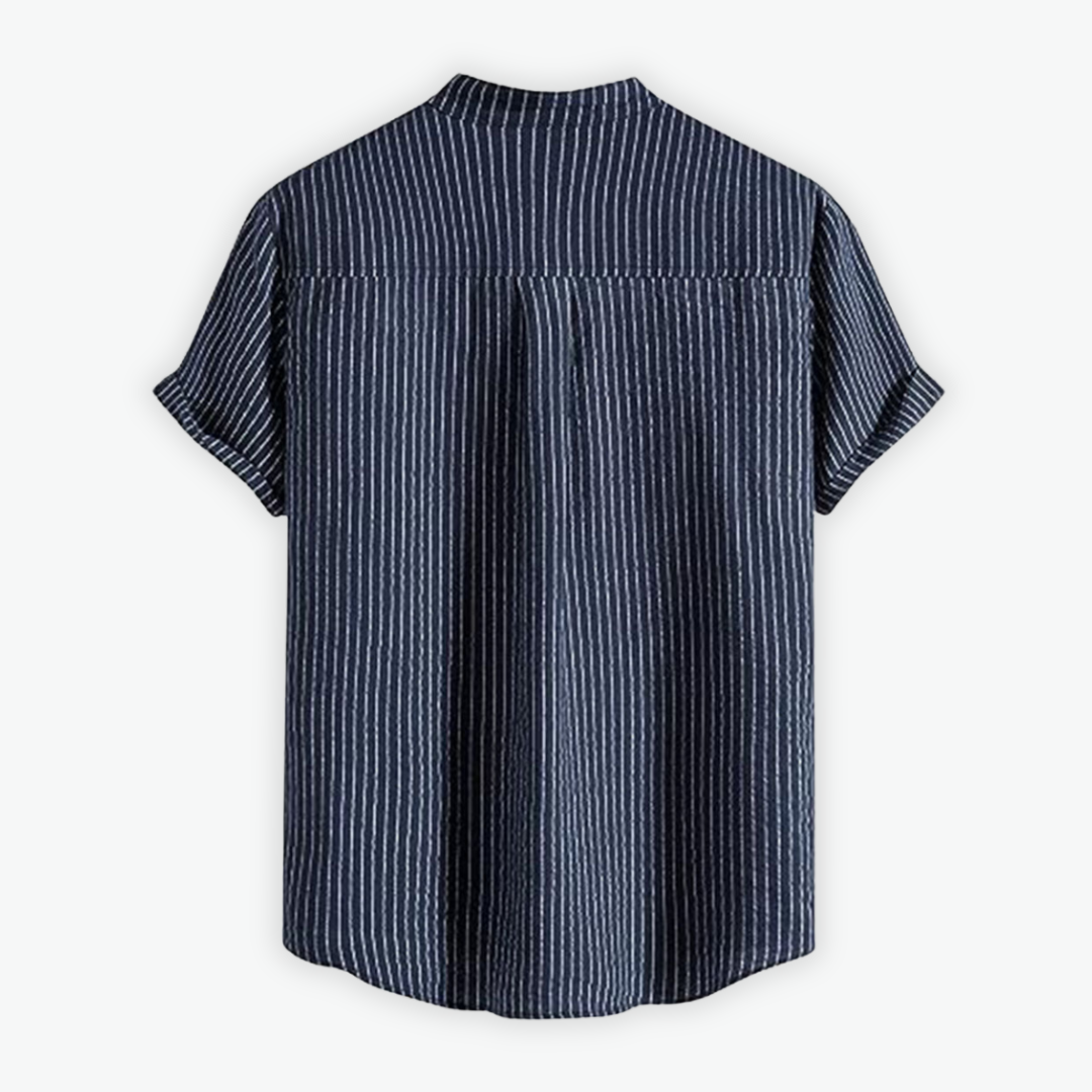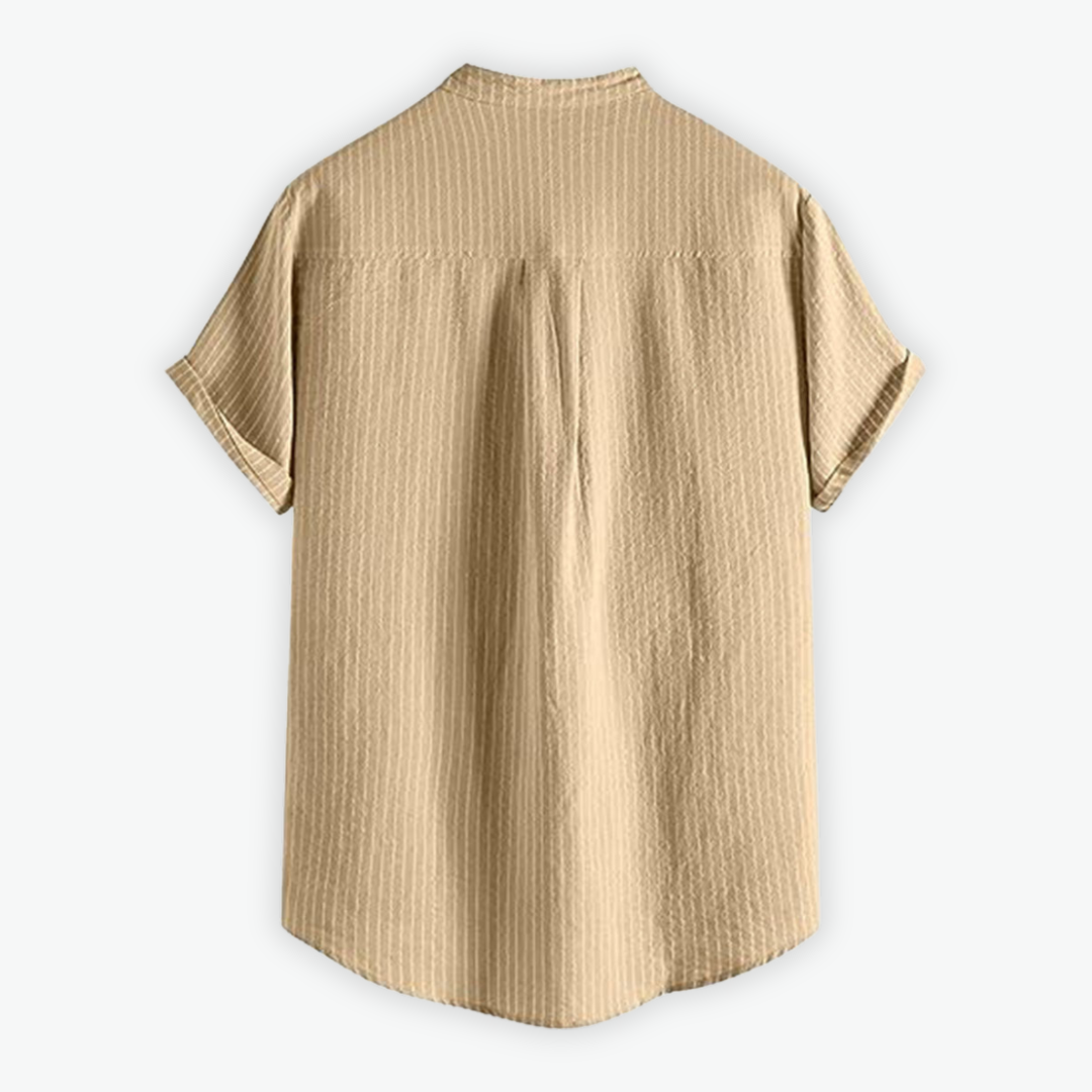 Ciro ist das ideale Hemd für warme Tage – mit lockerem Schnitt, dezentem Streifenmuster und einem modernen Stehkragen, der für einen eleganten Touch sorgt. Der leichte Leinenmix macht es zum perfekten Begleiter für Alltag und besondere Anlässe.