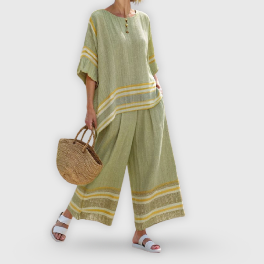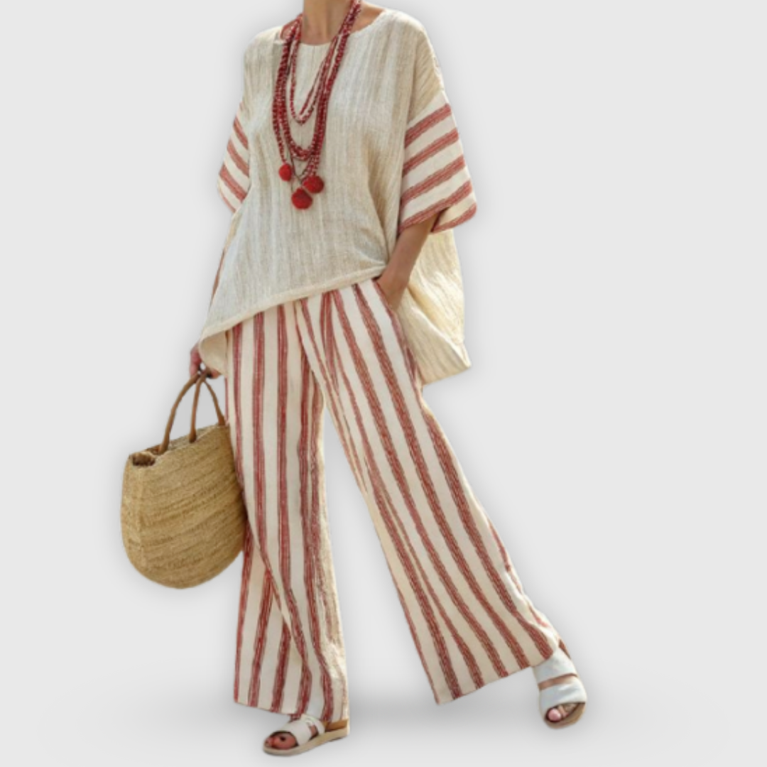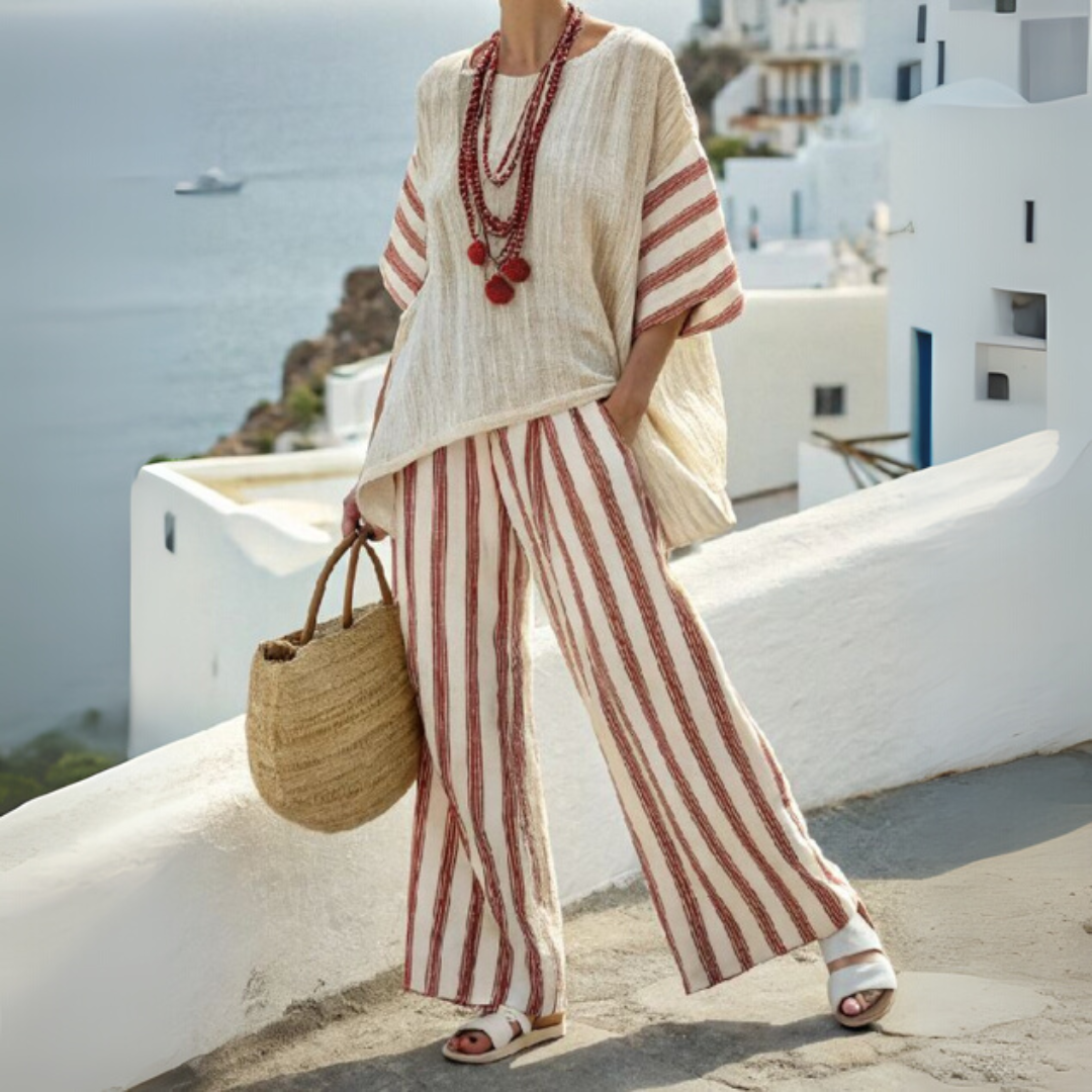 Alma ist ein luftiges Zweiteiler-Set mit einem eleganten Look, der gleichzeitig lässig und stilvoll wirkt. Das gestreifte Design, die fließende Passform und die vielfältigen Kombinationsmöglichkeiten machen es zur idealen Wahl für warme Tage – ob beim Brunch, auf Reisen oder beim Stadtbummel.