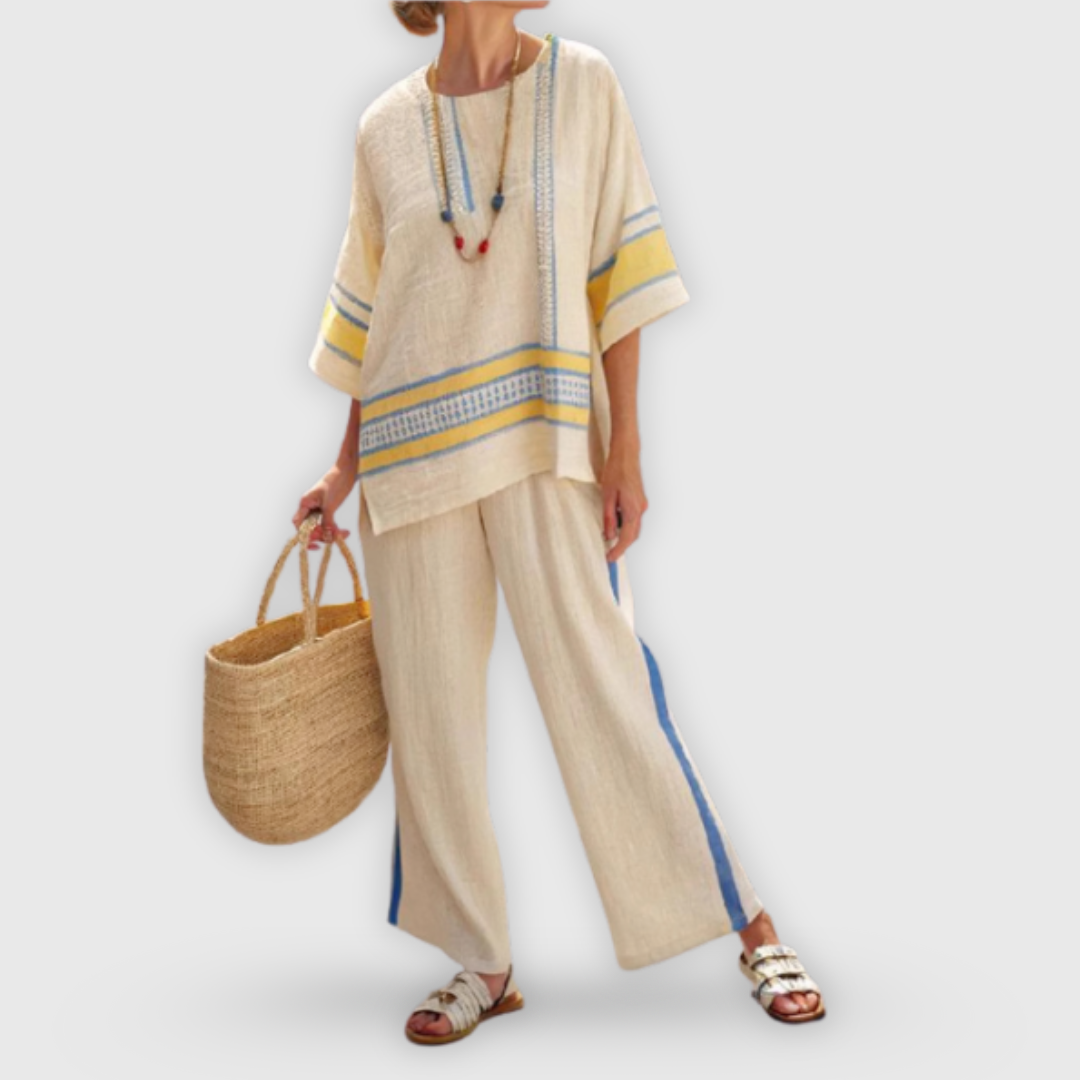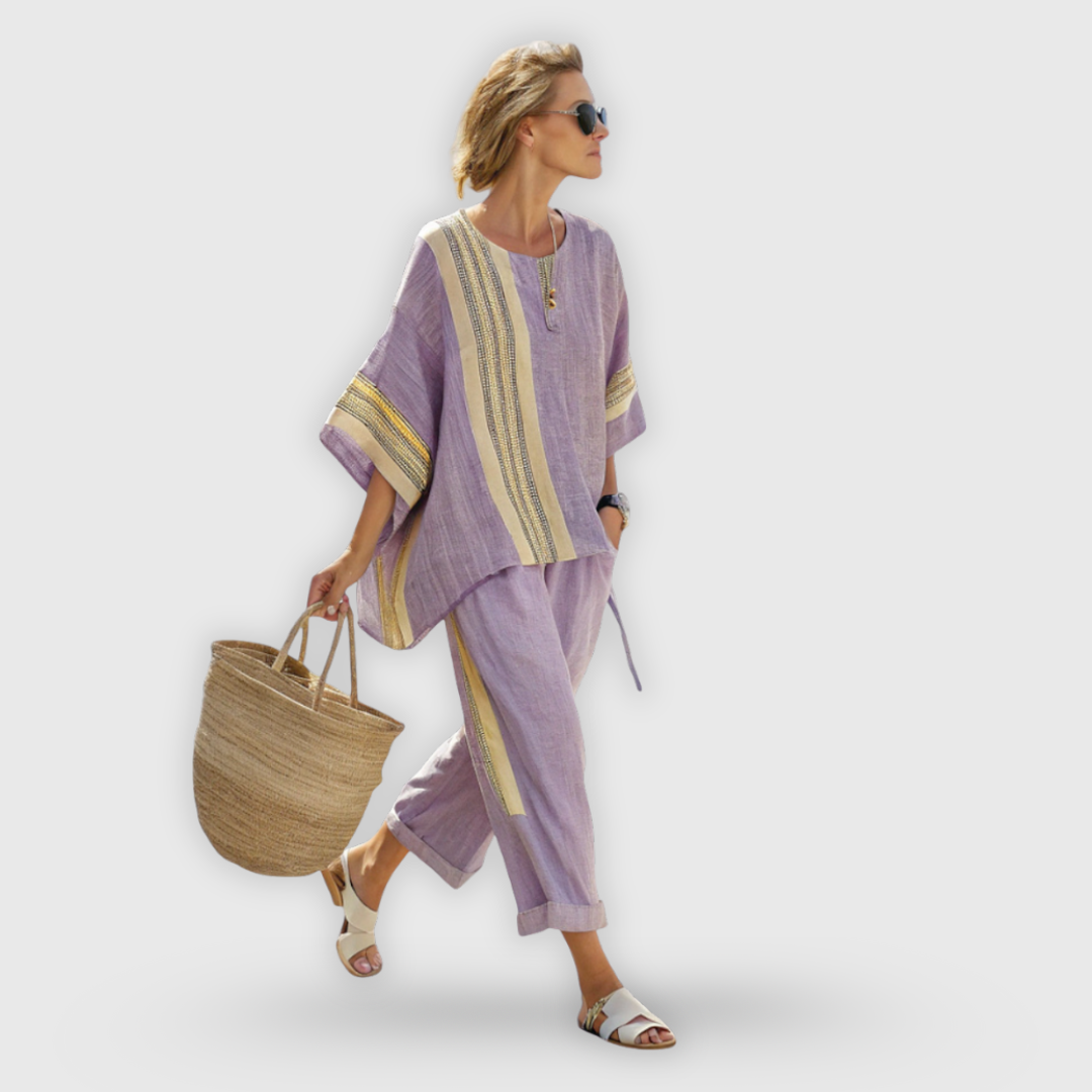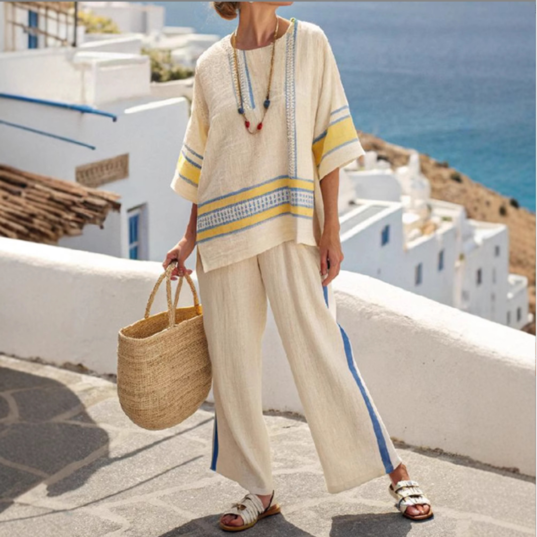 Alma ist ein luftiges Zweiteiler-Set mit einem eleganten Look, der gleichzeitig lässig und stilvoll wirkt. Das gestreifte Design, die fließende Passform und die vielfältigen Kombinationsmöglichkeiten machen es zur idealen Wahl für warme Tage – ob beim Brunch, auf Reisen oder beim Stadtbummel.